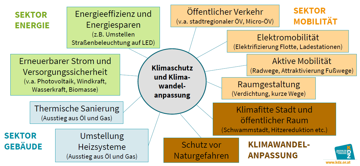 Klimaschutz und Klimawandelanpassung betreffen nahezu alle Aufgabenbereiche der Gemeinden, wie diese Übersicht zeigt: