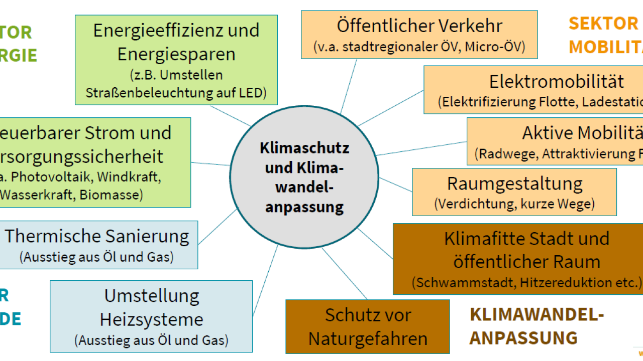 • Mobilität: Ausbau des öffentlichen Verkehrs (insbesondere stadtregional und Micro-ÖV), aktive Mobilität (Rad- und Fußwege), Elektrifizierung kommunaler Fuhrparks, Ladeinfrastruktur