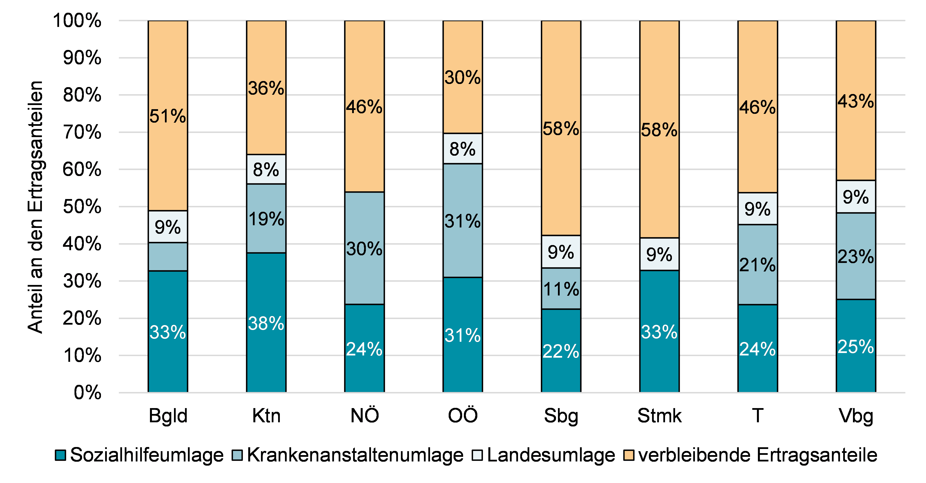 Abbildung 5: Anteil der Umlagen (Sozialhilfe-, Krankenanstalten- und Landesumlage) an den Ertragsanteilen nach Bundesland in Prozent, 2024