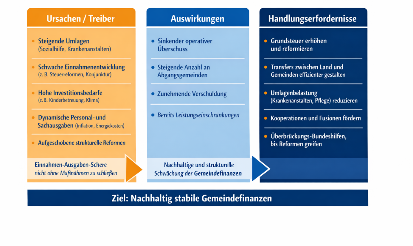 Entscheidend sind daher verbesserte gesamtstaatliche Rahmenbedingungen. Ein zentraler Ansatzpunkt wäre die Reform der Grundsteuer, um eine langfristig stabile und eigenständige Einnahmequelle für Gemeinden zu sichern. Ebenso würde eine Weiterentwicklung des Transfersystems zwischen Ländern und Gemeinden dazu beitragen, die dort befindlichen Effizienzpotenziale auszuschöpfen. Parallel dazu gilt es, die Rahmenbedingungen für interkommunale Kooperationen und freiwillige Gemeindefusionen weiter zu verbessern.