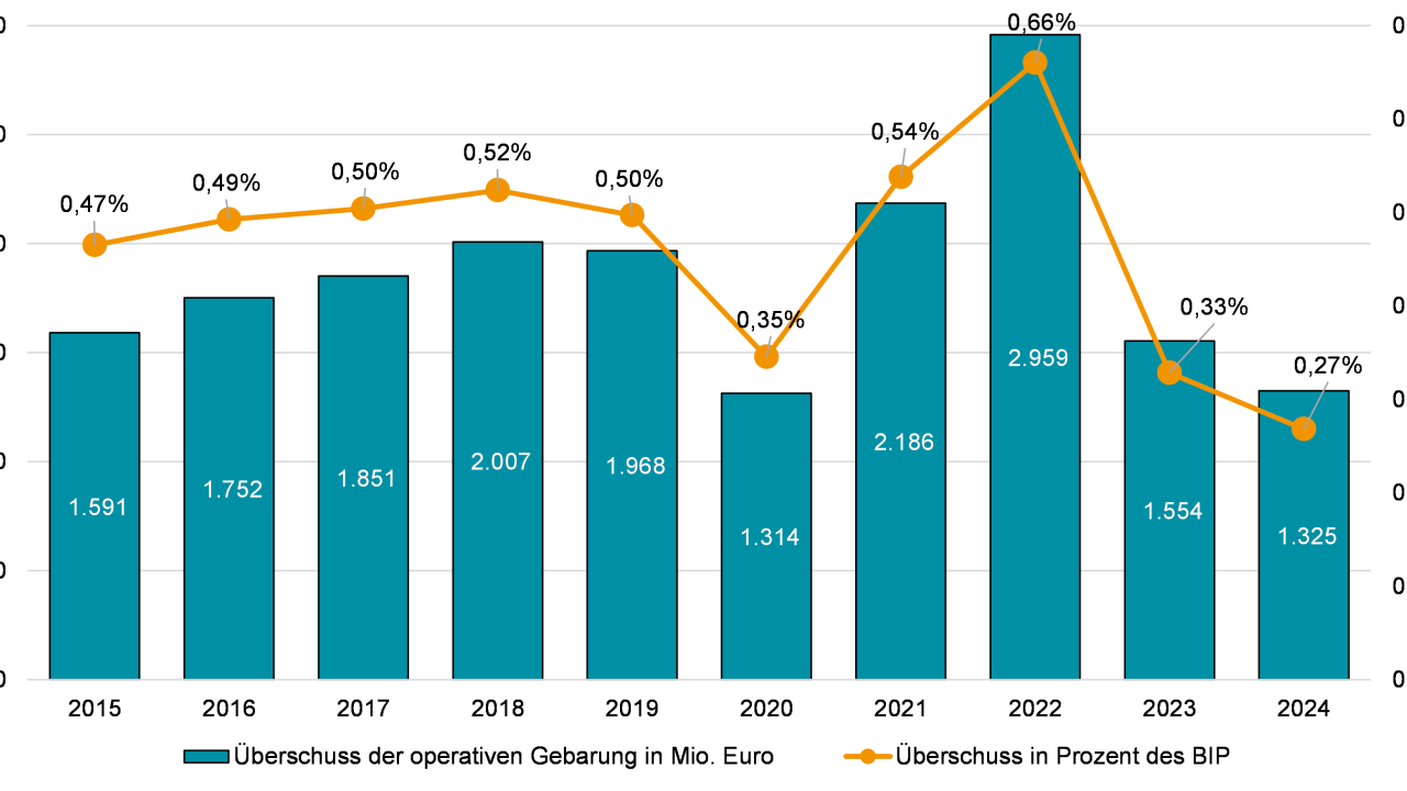 Die finanzielle Situation der österreichischen Gemeinden hat sich im Jahr 2024 weiter verschlechtert. Der operative Überschuss (Abbildung 1) hat sich im Vergleich zum Vorjahr erneut reduziert und ein Minimum von 0,27 Prozent des Bruttoinlandsprodukts (BIP) erreicht. Dies entspricht nur noch der Hälfte der Jahre vor 2020.
