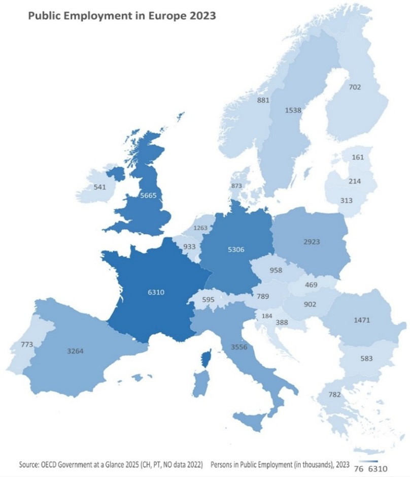 The following map illustrates the absolute number of people employed in the public sector across Europe in 2023. Altogether, 35.272 million people work in public employment across the European Union1.