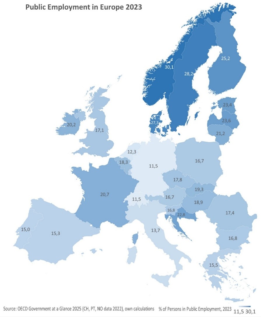 The map reveals substantial variation among countries. Germany records the lowest share within the EU, at 11.5%, pointing to a comparatively small public sector in relation to total employment. At the other end of the spectrum, Sweden shows the highest share in the EU, at 28.3%, reflecting the strong role of the public sector in Scandinavian welfare and administrative systems.