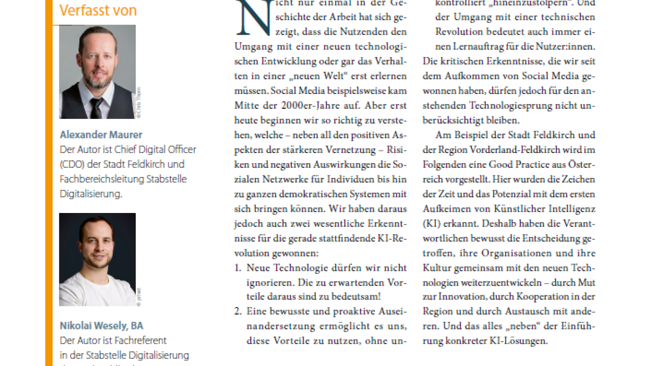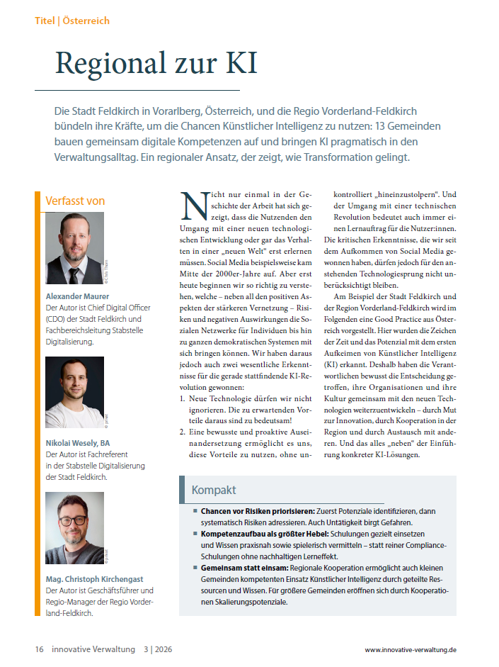 Ein aktueller Beitrag im Magazin innovative Verwaltung – der führenden Fachzeitschrift für modernes Verwaltungsmanagement – beleuchtet, wie die Stadt Feldkirch gemeinsam mit der Region Vorderland-Feldkirch den Einsatz von Künstlicher Intelligenz strategisch vorantreibt. Die Zeitschrift informiert praxisnah über zentrale Themen wie Organisation, Personal, Finanzen sowie Informations- und Kommunikationstechnik in der öffentlichen Verwaltung.