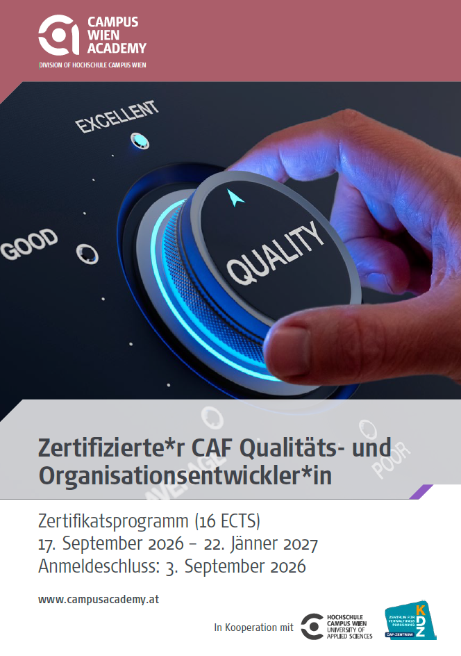 Der Lehrgang „Zertifizierter CAF Qualitäts- und Organisationsentwickler*in“ richtet sich an Fach- und Führungskräfte der öffentlichen Verwaltung, die Veränderungsprozesse aktiv gestalten und ihre Organisation strategisch weiterentwickeln möchten. Im Zentrum steht das Common Assessment Framework (CAF), ein europaweit etabliertes Qualitätsmanagementinstrument für den öffentlichen Sektor.