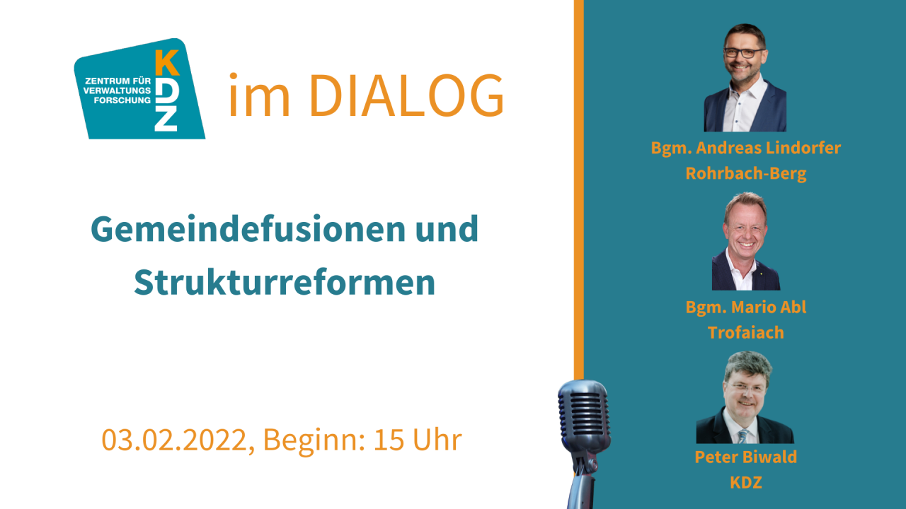 In den letzten Jahren haben zahlreiche Städte und Gemeinden fusioniert und Strukturreformen umgesetzt. Was sind dabei die Herausforderungen und wie geht es diesen Städten und Gemeinden heute? Diese und andere Fragen diskutieren wir am 03.02.2022 mit Bürgermeister Andreas Lindorfer (Stadtgemeinde Rohrbach-Berg, OÖ) und Bürgermeister Mario Abl (Stadtgemeinde Trofaiach, Stmk). Beide sind Bürgermeister fusionierter Gemeinden.