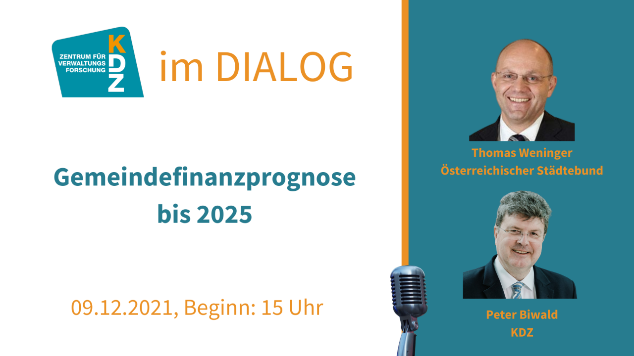 Es diskutieren KDZ-Geschäftsführer Mag. Peter Biwald und der Generalsekretär des Österreichischen Städtebundes Dr. Thomas Weninger. Die Onlineveranstaltung ist kostenlos und für alle Interessierten zugänglich. Die Tonspur der Veranstaltung wird im Nachhinein als Podcast veröffentlicht.